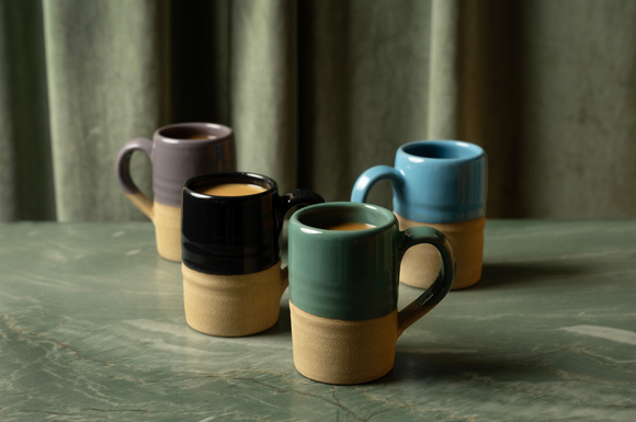 Our Toasted clay mugs are now available as an eclectic set. This quartet features Warm Sky Blue, Shiny Green, Lavender, and Black glazes.