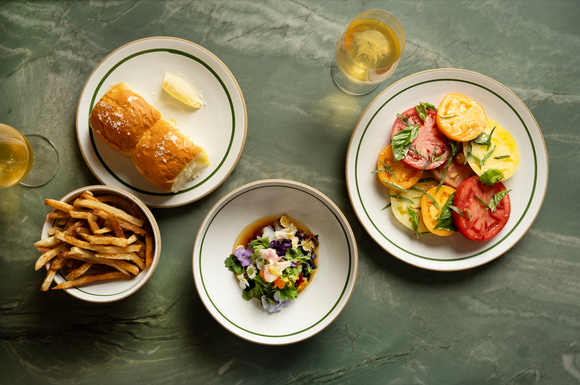 Serving: Housemade Bread & Butter, French Fries, Tomato Salad, & Fluke Ceviche with Sesame, Birds Eye Chili, Fresh Herbs & Flowers